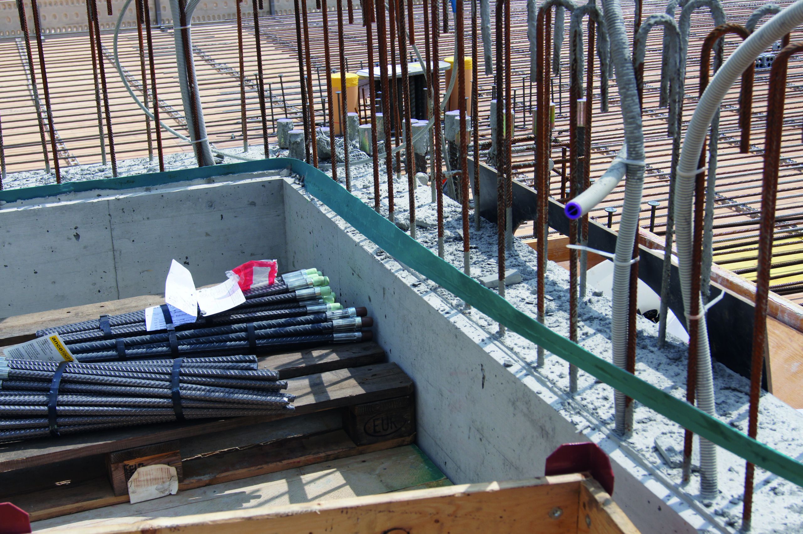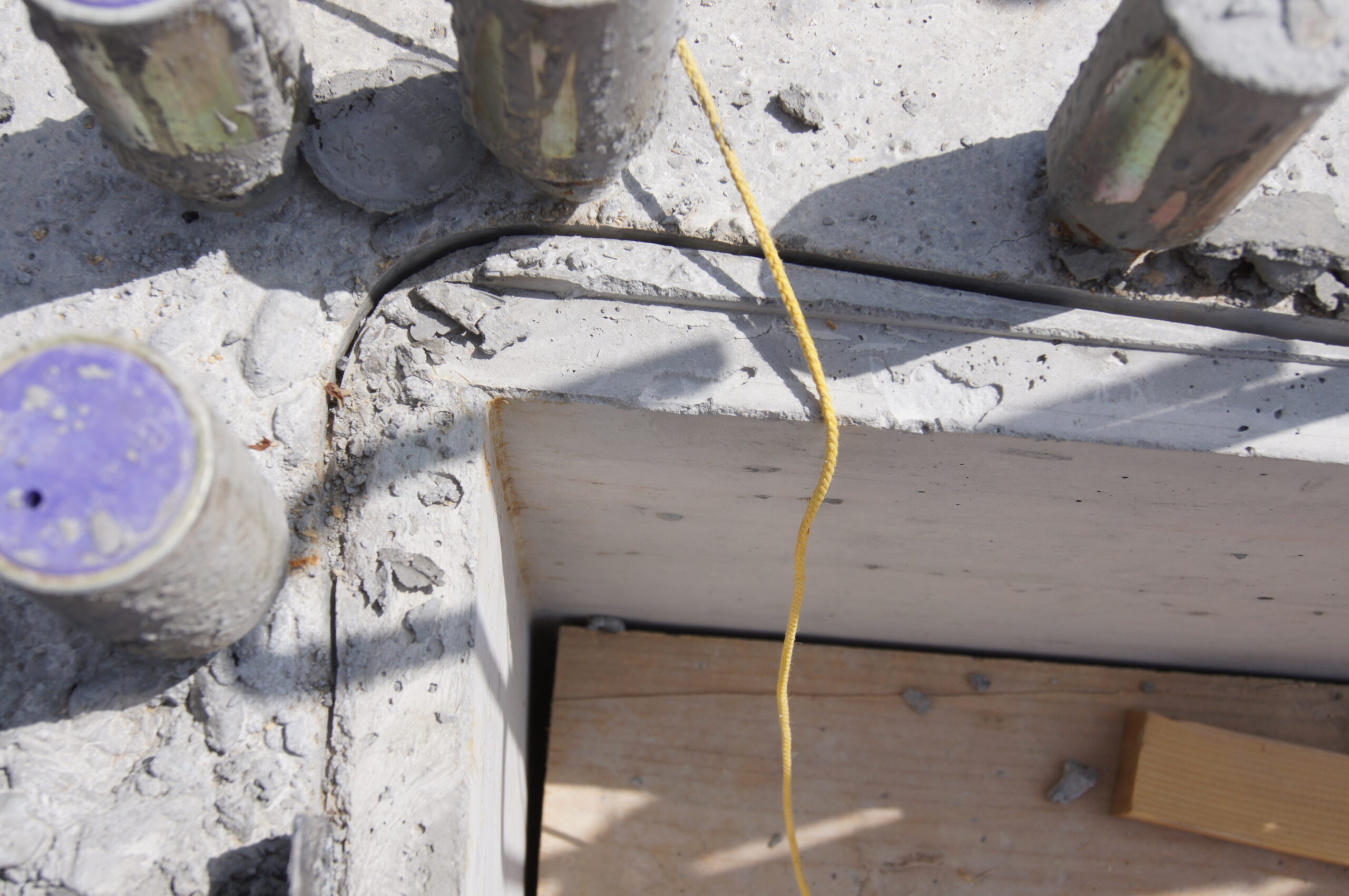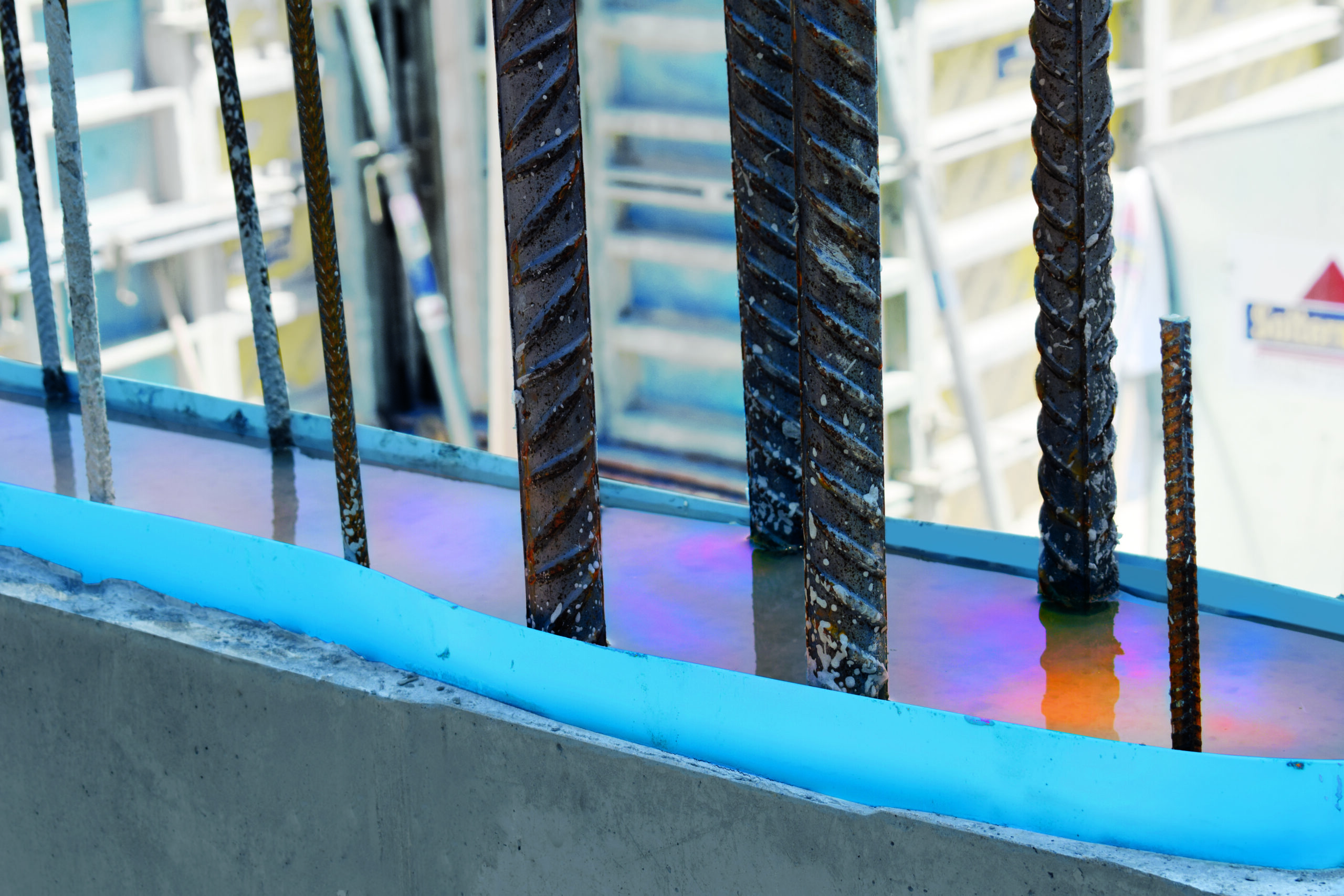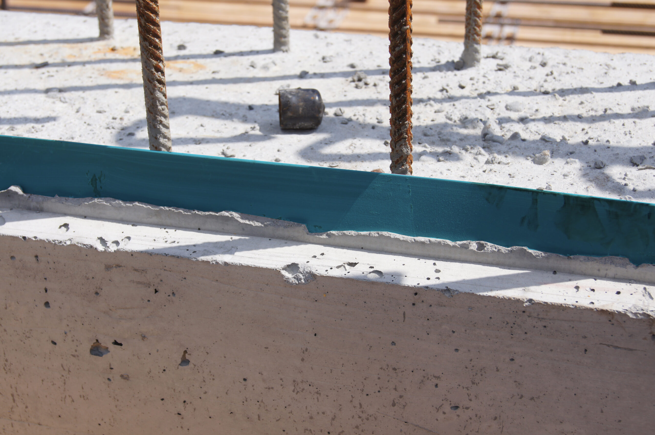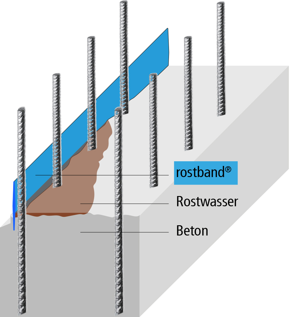 Das flexible Kunststoffband in der Mauerkrone verhindert, dass Rostwasser die Wand runterfliest. rostband staut konsequent das Rostwasser der Anschlusseisen. Das konische rostband ist mühelos wieder rauszuziehen. So sorgt die Sperre gegen Rostwasser für saubere Sichtbetonwände.