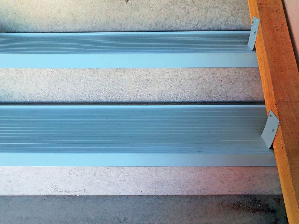 Der robuste Treppenschutzwinkel aus Hart-PVC schützt den Auftritt und die exponierte Kante verlässlich vor Schlägen. Stufe für Stufe verlegt, werden die Winkel jeweils entweder mit einem Bügel fixiert oder mit einem Kantholz miteinander verbunden. Antirutschrillen gewährleisten die Sicherheit.